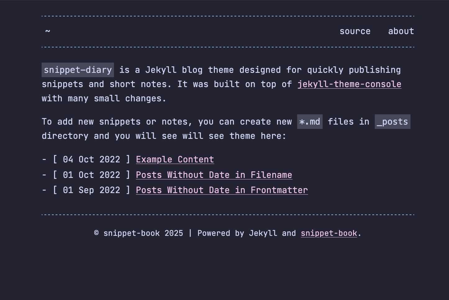 snippet-book is a Jekyll blog theme based on jekyll-theme-console with a few changes: