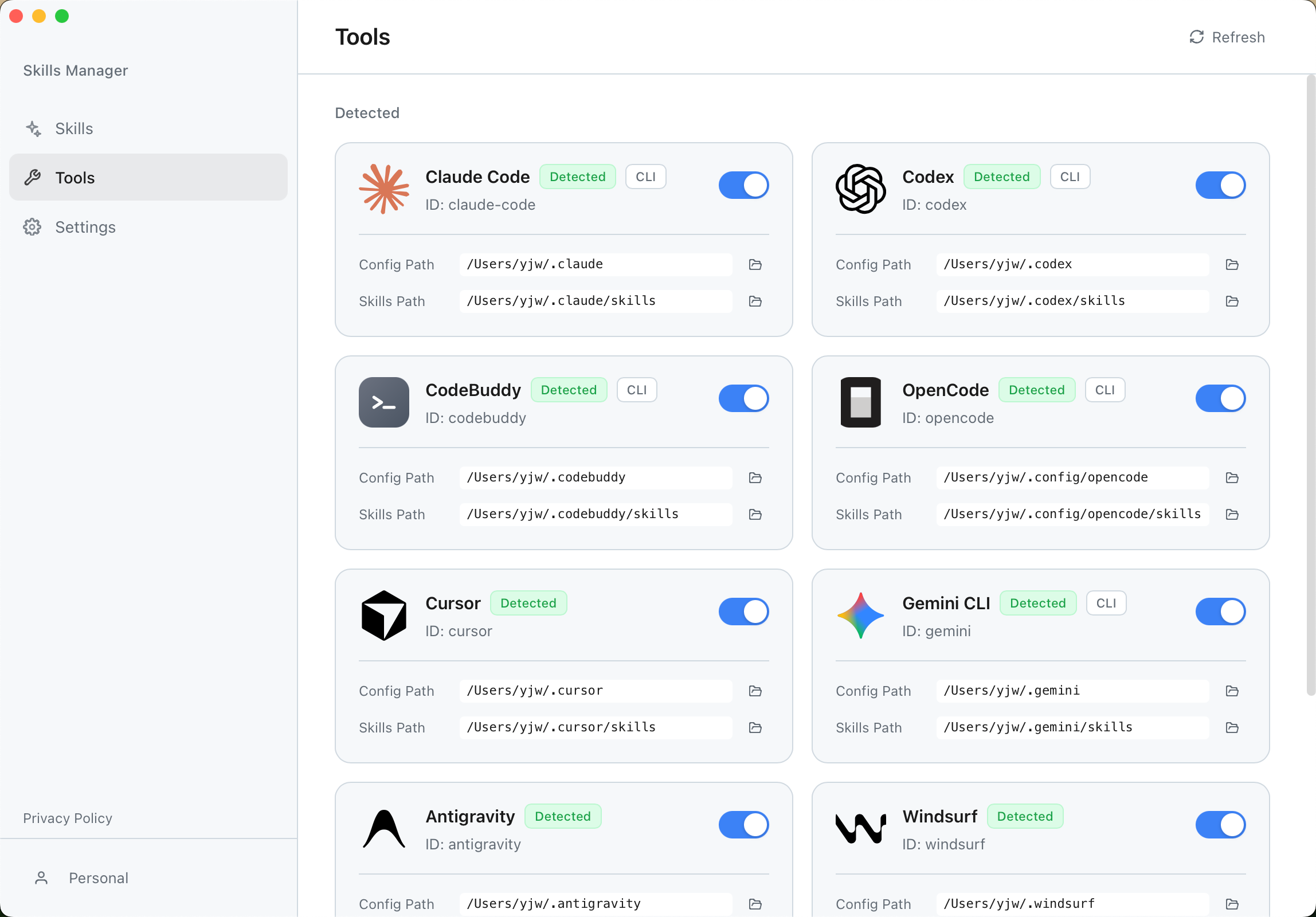- Sync: The app automatically detects installed AI tools (like Claude Code) and links your skills.