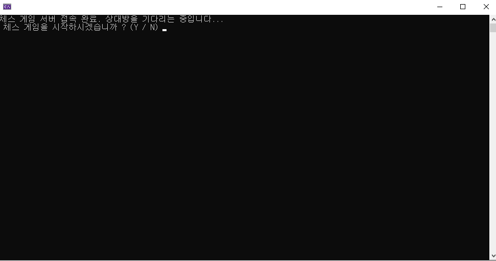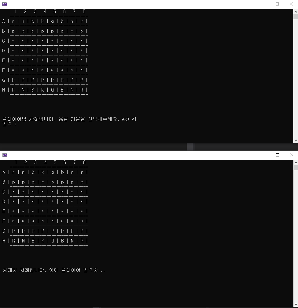 ChessGame TCP Socket 통신을 이용한 체스 게임 실행 방법 1. ChessGame.sln 실행 2. ChessGameClient.sln 실행 (Player 1) 3. ChessGameClient.sln 실행 (Player 2) Player1, Player2 콘솔창에 y 입력 후 엔터 4. ChessGameClient 실행 화면 Player1, Player2 가 모두 승인하면 게임 시작됨 5. ChessGame.sln (서버 역할) 콘솔창