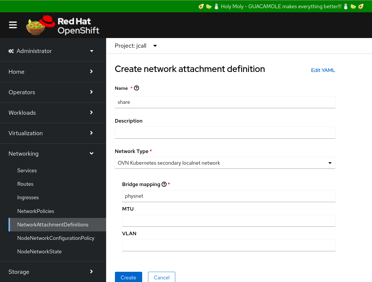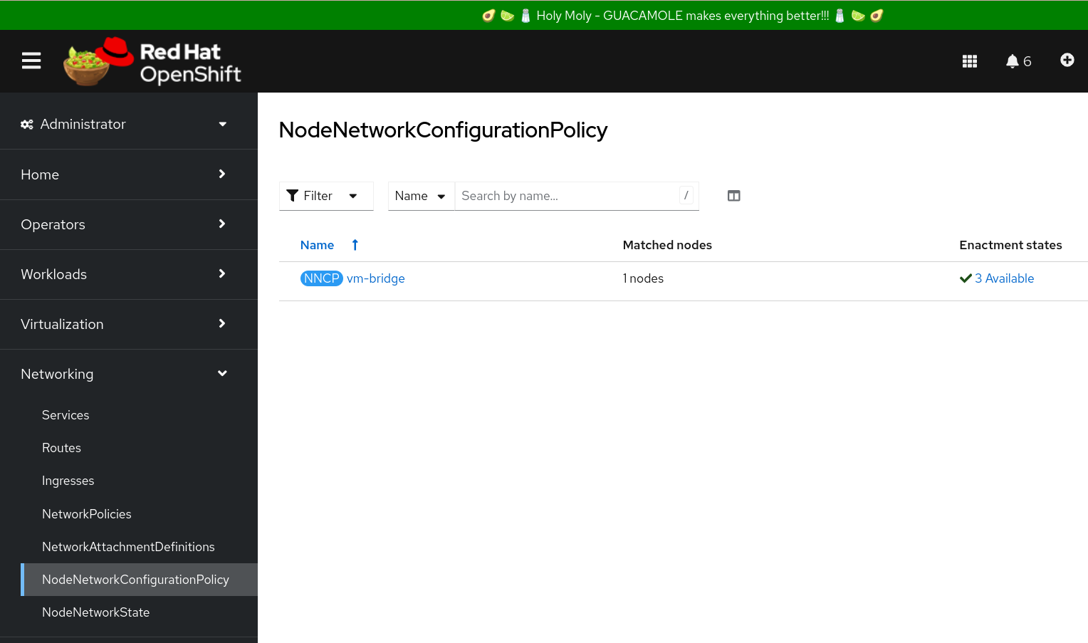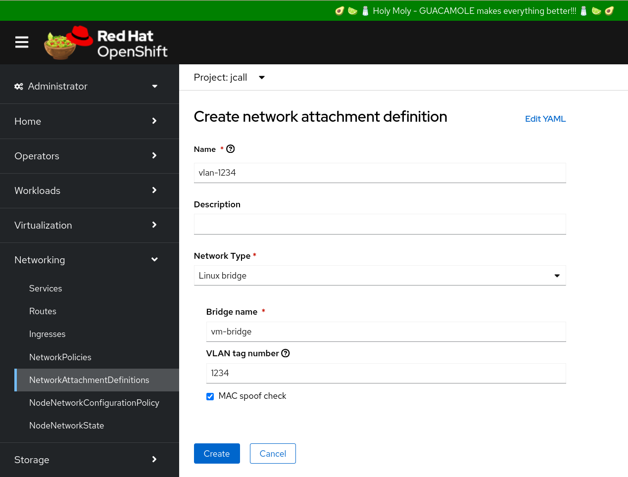 Now that the server/host/node(s) have their physical interfaces and bonds added to a bridge, it's time to create the "vSwitch" / "Distributed Port Group". In other words, what OpenShift calls a NetworkAttachmentDefinition. Please be aware that net-attach-defs (the short name, which is better than NADs) must be created in a particular project. Please avoid creating these in the default namespace/Project.