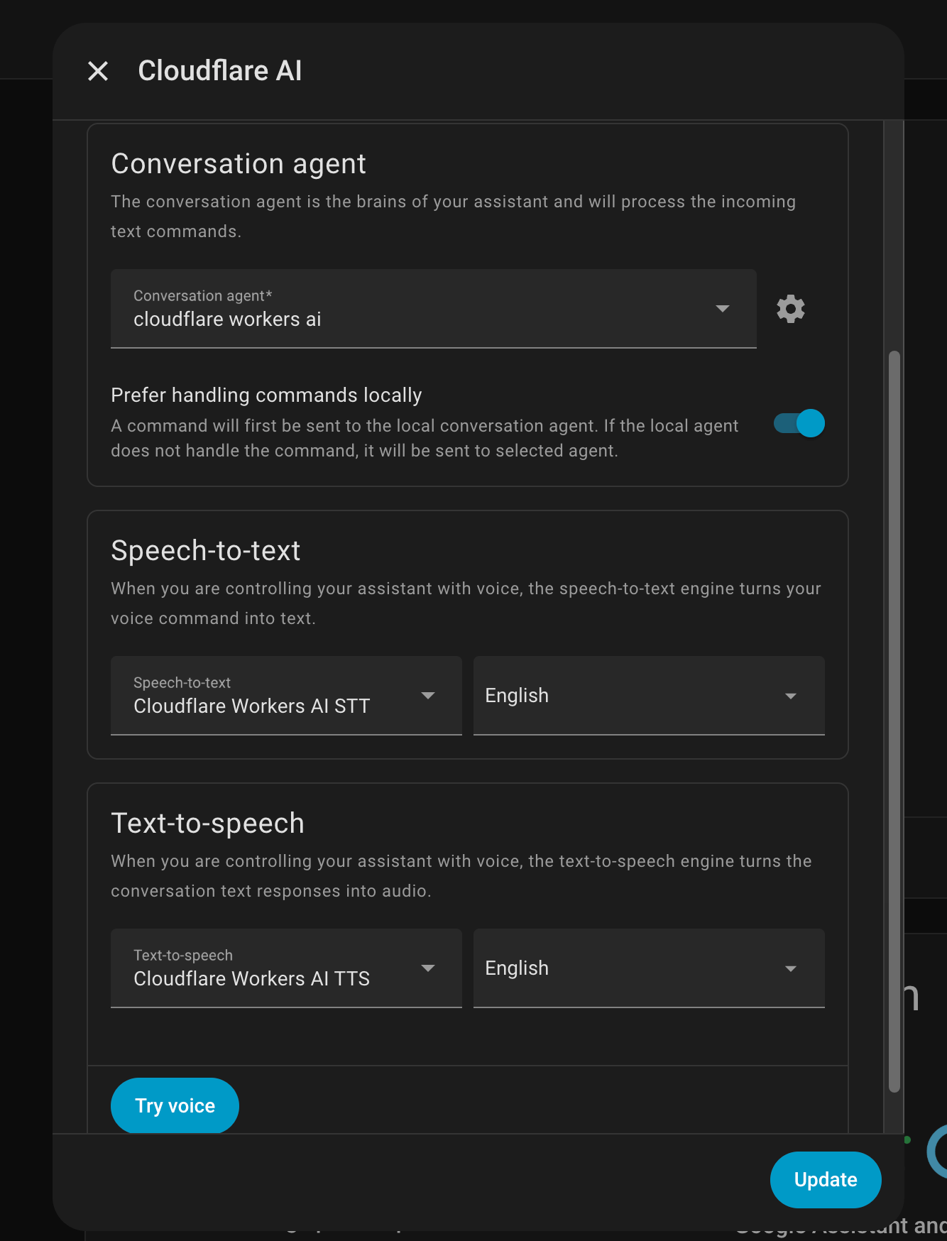 A comprehensive Home Assistant integration that brings Cloudflare Workers AI capabilities to your smart home, including Text-to-Speech, Speech-to-Text, and Conversation (LLM) with full device control for the Assist pipeline.