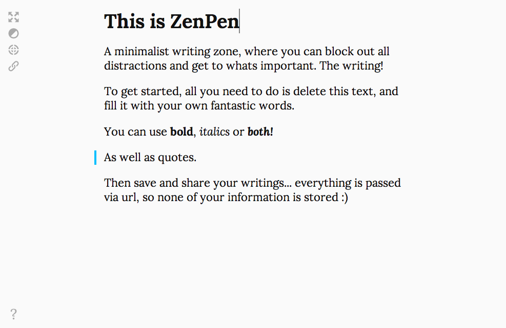 ZenPen - The minimal editor for the modern man Zenpen (http://zenpen.io) is a web app for writing minimally, and getting into the Zone. All information is persistant locally, using HTML5 local storage, and sharable via URL Hashes ##ZenPen's minimal interface ##Text styling ##Sharing via url's