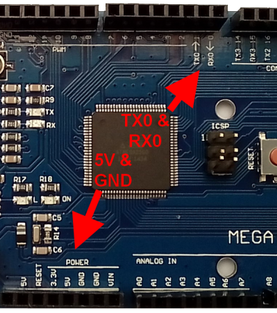 The BT module connects to the Mega through the TX0 and RX0 pins, and the 5V and GND (ground) pins. The Mega connects to the BT module as follows: