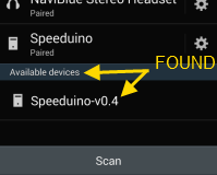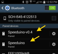 Once the BT module reprogramming is completed in the following section; a scan by your phone or tablet should have your Speeduino appear as an available device with the new name you assigned it. In the Android example below, there is one Speeduino already paired by Bluetooth, and it has found a second Speeduino, called "Speeduino-v0.4":
