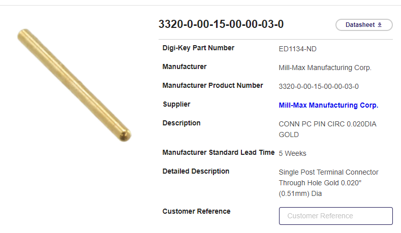- https://www.mill-max.com/products/printed-circuit-board-pcb-pin/straight-pin/3320 (0.51 mm diameter, 6.35/12.70 length for 3320-0/3320-1)