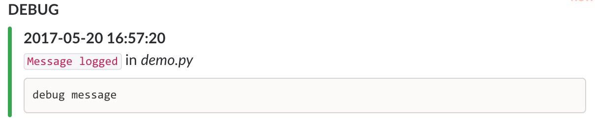 logger.debug('debug message')SlackHandler does not accept any formatter. By default it's messages will have the following format: