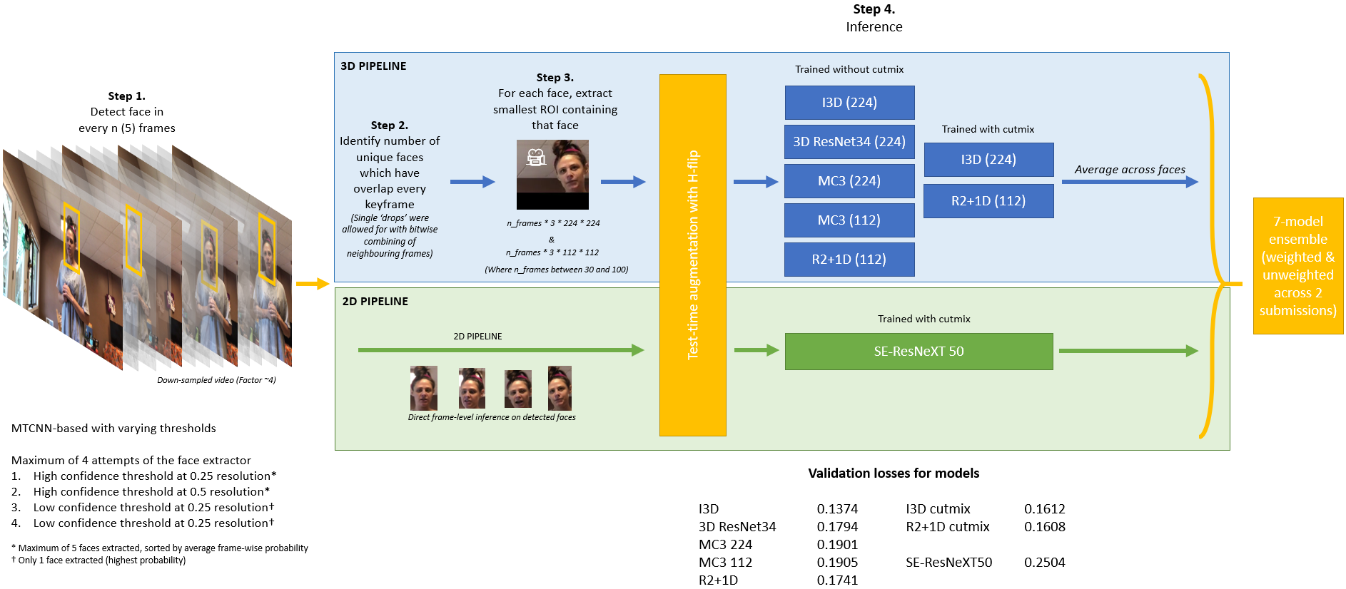 We trained 7 different 3D CNNs across 4 different architectures (I3D, 3D ResNet34, MC3 & R2+1D) and 2 different resolutions (224 x 224 & 112 x 112). The validation losses of the 3D CNNs ranged between 0.1374 and 0.1905. I initially struggled to fit models with spatial-level augmentation, finding they were so disruptive that the model struggled to tell real apart from fake. I had therefore only been using only pixel-level augmentation such as brightness (and Hflip) and some random cropping. However, Ian developed what we hope is a very successful 3D cutmix approach which led to models with good CV scores to be trained and were added to the ensemble.