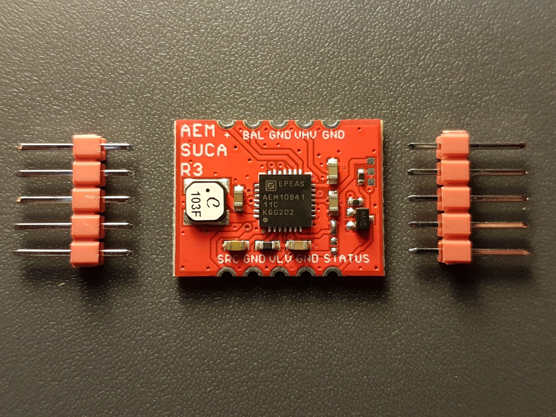 The AEMSUCA is a 15x20mm board for the AEM10941 Solar Harvesting IC from E-peas. It efficiently converts solar panel energy into SUperCApacitor charge, it even works with indoor light. It features two regulated outputs that are enabled when the supercapacitor has sufficient charge, and a low voltage warning that informs the user of impending shutdown when the supercapacitors run low. It easily integrates in other projects because of the castellated via's, and when soldered onto 0.1' pitch header it fits in a bread board.