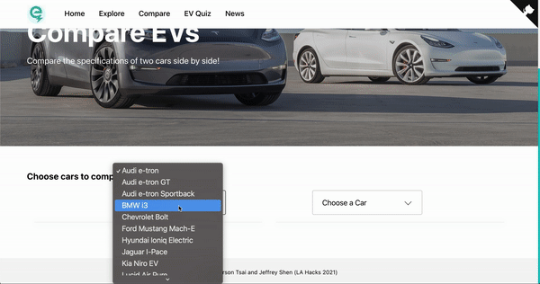 The news page has stock information of various companies at the top, where a ticker is red when the company's stock price is down on the day, and green when the company's stock is up on the day. Below the stock section, news articles pertaining to electric vehicles are shown, where the image, title, date, description, and sentiment score are displayed for each article. The sentiment score is determined by feeding the contents of the article into the Google Cloud natural language processing service. The stock and news information is updated live, and retrieved using API's provided by GNews and AlphaVantage.