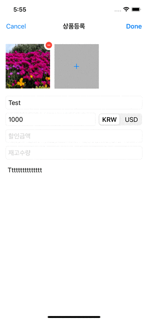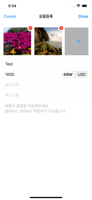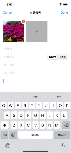- 목록 화면의 우상단 버튼을 탭하면 상품 등록 화면을 나타냅니다.