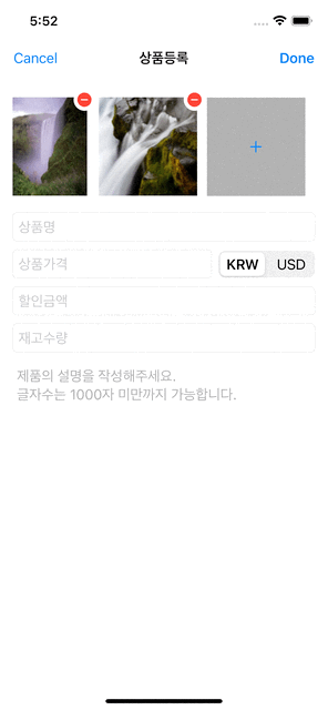 FooterView에+버튼을 올려서 사용자의Tap Gesture를 감지하도록 했습니다. - 이미지 용량이 300KB를 초과하지 않도록 크기를 조정했습니다.