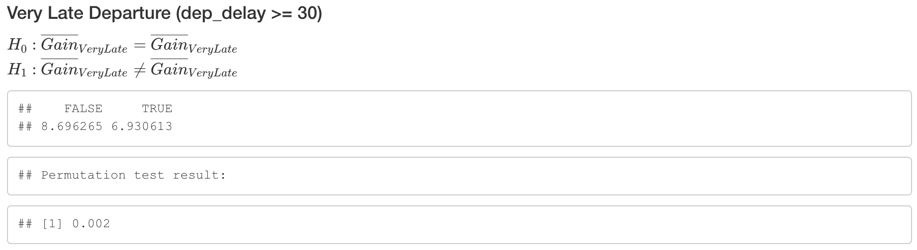 Based on the above Very Late Departure (dep_delay >= 30) permutation test results, we may conclude that there is a statistically significant difference in average gain between very late flights and non-very late flights because the p-value is 0.002, which is less than 0.05.