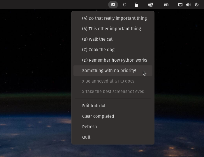 todo-indicator ~/todo.txtClick the indicator icon to see your list. If you finish one of your tasks, give yourself a pat on the back and click it! It'll be marked "done."