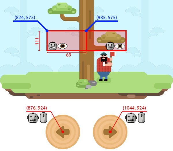Só precisamos nos preocupar com a região logo acima do lenhador, portanto nos preocuparesmo apenas com os retângulos em vermelho com os símbolos de robozinho e olho; em azul temos as coordendas do canto superior esquerdo e nas linhas ao longo do retângulo esquerdo, as dimensões da região de interesse. O controle se dá com cliques nos dois botões abaixo da tela principal do jogo. As coordenadas do centro dos botões estão escritas próximo dos símbolos de robozinho e mouse. Todas essas regiões foram encontradas a partir de uma screenshot tirada do jogo e analisada num editor de imagens e anotadas a parte. Também com a ajuda do editor de imagens eu recortei apenas as imagens de um galho da esquerda (left_branch.png) e outro da direita (right_branch.png), como na Figura a seguir.