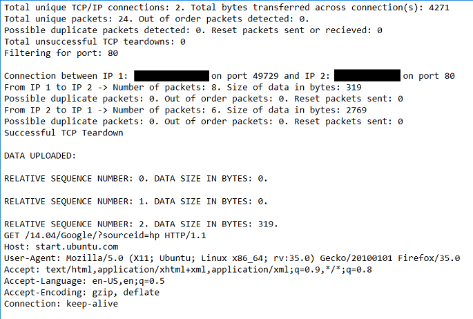 This example includes the global header begining with Total unique TCP/IP connections, the conversation header beginning with Connection between, the packet headers beginning with Relative sequence number, and the data, which can be seen beneath the third packet.