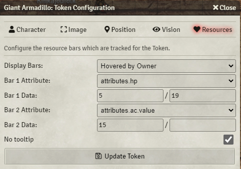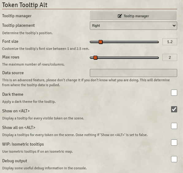 Tooltip placement: Self-descriptive, chose where the tooltip should be shown. (Configurable by players)Font size: You can change the font size to a value between 1 - 2.5 rem. (Configurable by players)Max rows: Determins how many rows should be in a column. (Configurable by players)Data source: This is an advanced feature, with this you chose how deep into the token object the search for values start.Show all tooltips on ALT: If true, when pressing ALT you will see a tooltip for every visible token on the scene.Dark theme: If true, will show the tooltips with a dark theme. (Configurable by players)Show on <ALT>: If true, when pressing ALT *every visible token on the screen will display a tooltip.Show all on <ALT>: If true, when pressing ALT *every token on the screen will display a tooltip.Isometric tooltips: If true, and you are on an isometric map it will position the tooltip in front of the token with an isometric perspective.Debug output: If true, will display some useful debugging information in the console.