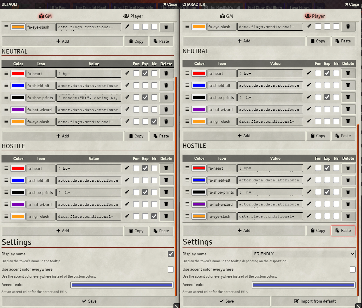 This section is divided into two. The settings for the GM, and the settings for the PLAYER, so you could have full control over what players see versus what the gm sees.