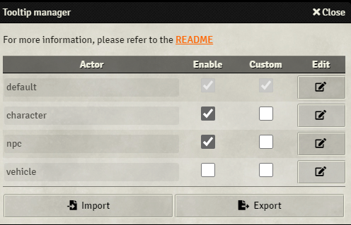This section displays all the available actor types, from here you can decide if they should display a tooltip, by checking the enable checkbox.