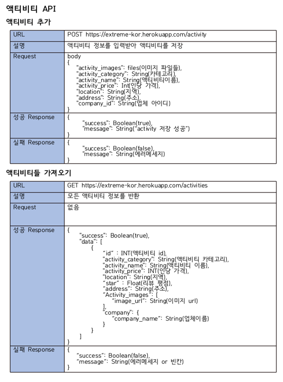 Extreme (Back-end) 날씨정보를 이용한 야외 액티비티 예약 애플리케이션 팀 구성 김강민 김은서 kkmin223 EunSeo119 주요 기능 액티비티 상품 정보 제공 상품 상세 정보 제공(리뷰, 상품 상세 정보) 검색 기능 날씨 정보를 이용한 일정 예약 기능 마이페이지(주문 내역) 날씨 지도(전국 날씨 정보 제공) Stack Node.js MySQL Heroku Amazon S3 데이터베이스 테이블 명세 데이터베이스 명세 API 명세서 API 명세서 화면