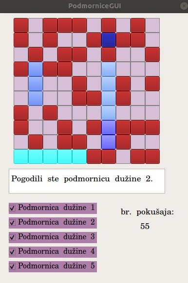 Ovo će izenerisati Makefile u tekućem direktorijumu. Uz pomoć komande make će se generisati izvršni fajl PodmorniceGUI, koji je potrebno pokrenuti komandom ./PodmorniceGUI Ovo će pokrenuti igru. Srećno :)!