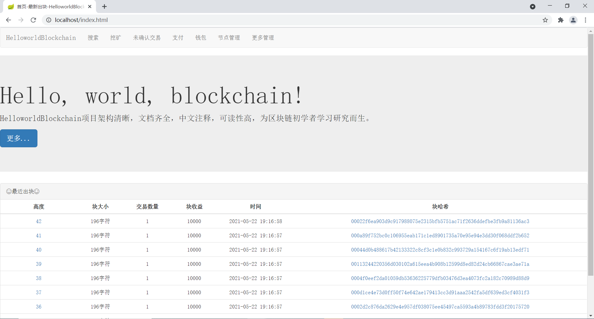 HelloworldBlockchain项目没有任何复杂依赖,将项目导入idea,找到类文件com.xingkaichun.helloworldblockchain.application.HelloWorldBlockchainApplication,右键运行,正常情况下则会启动成功。接下来,打开浏览器,访问项目的前端地址 http://localhost/ ,快乐的调试玩耍吧。