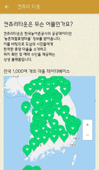 도심의 시민들에게 한적한 휴양 마을을 소개하고 위치, 날씨 정보 및 예약 수단을 제공하는 도시/농촌 상생 플랫폼