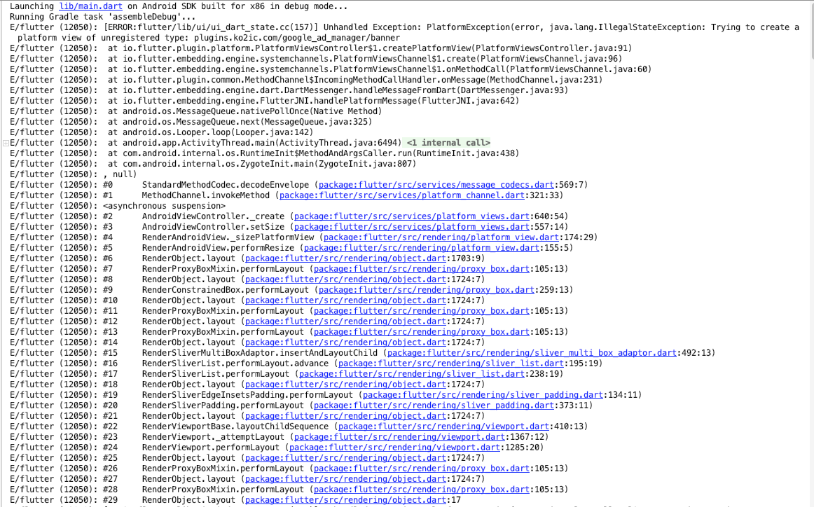 I've tried to add an ad (BANNER or MEDIUM_RECTANGLE) with no success. I get this error message every time. A space is allocated in my app but no ad is displayed. I'm too much of a newbie to flutter/java to understand what the issue is about.