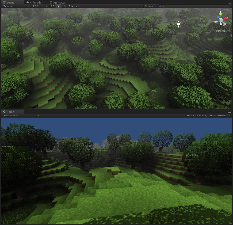CraftSaga is another sanbox game (like Minecraft, Infiniminer etc.) made with Unity 4.x (currently 4.6). The project is divided up by two projects: Unity Project and Mesher. Unity Project contains all assets and scripts necessary to the game itself. Mesher is a C++ project, which building up provides plugin for transforming voxels into textured polygons.