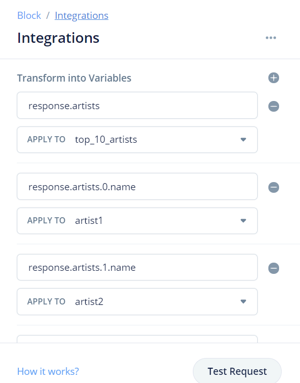 Music-App This app fetchs and gives you track of top 10 artists using Voiceflow channel. API Used: https://api.napster.com/v2.2/artists/top Voiceflow Design Inside integration block: