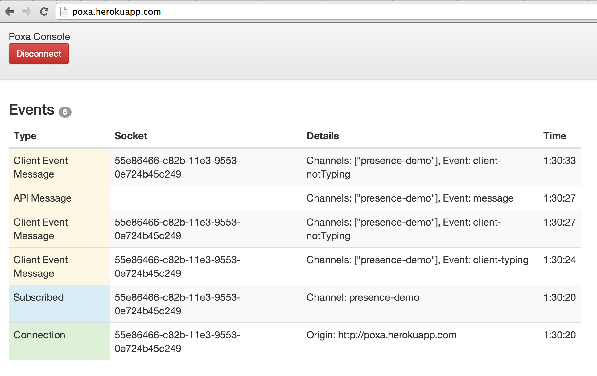 You can see it in action on http://poxa.herokuapp.com using "app_key" and "secret" to connect. Now open the poxa-presence-chat and watch events happening!