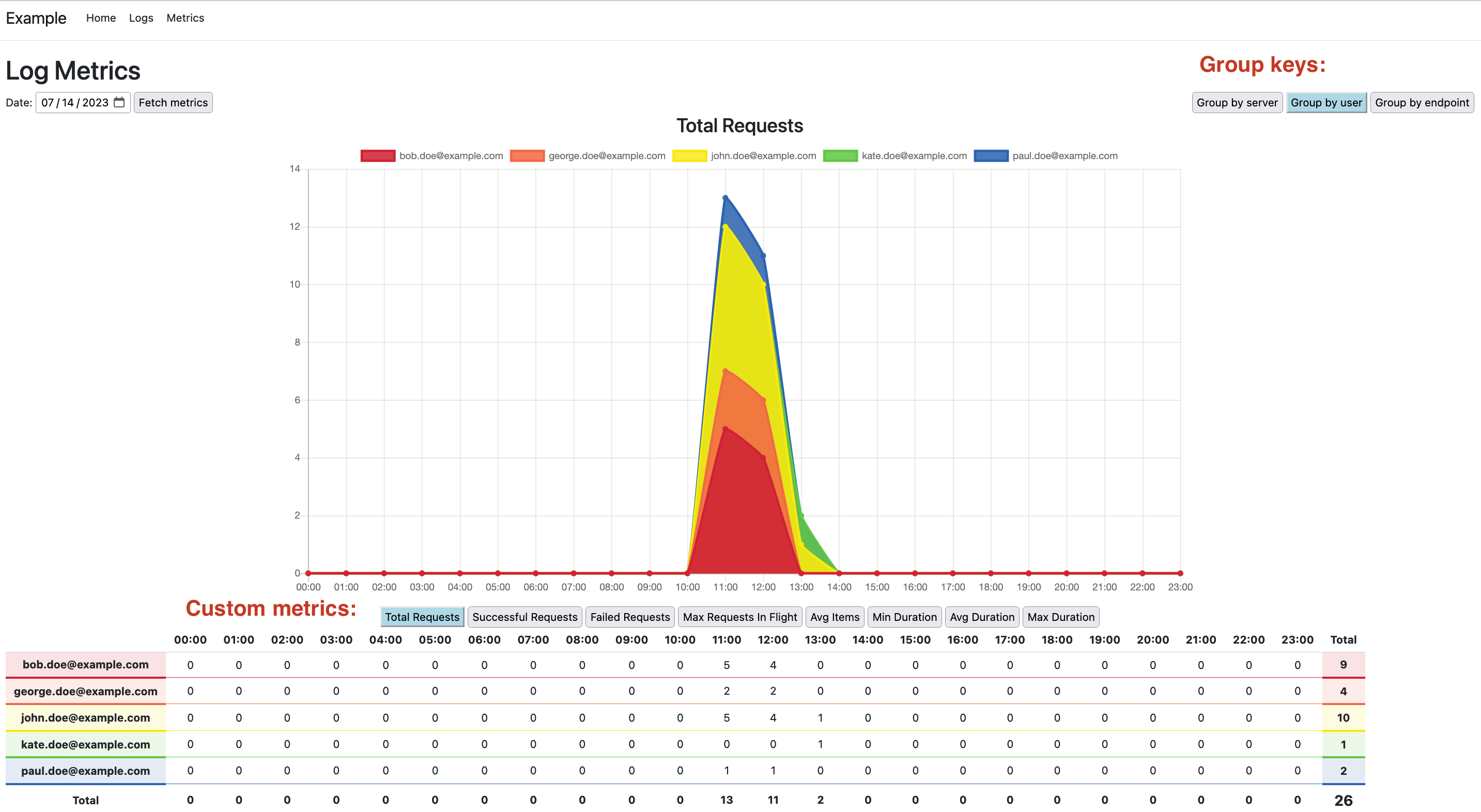 Call to fetch metrics for a given day will be distributed to all web application nodes, which will parse the logs and return the metrics which will then be displayed on the chart and in the table below.