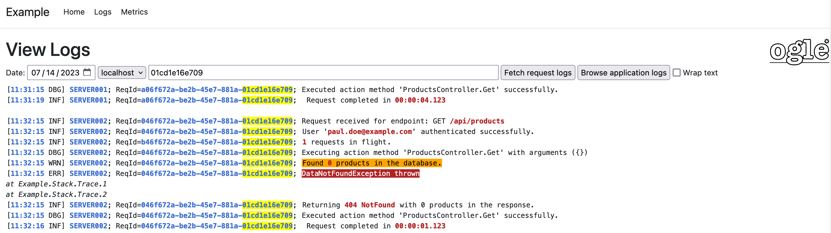 - View log details for a particular request id or a search term