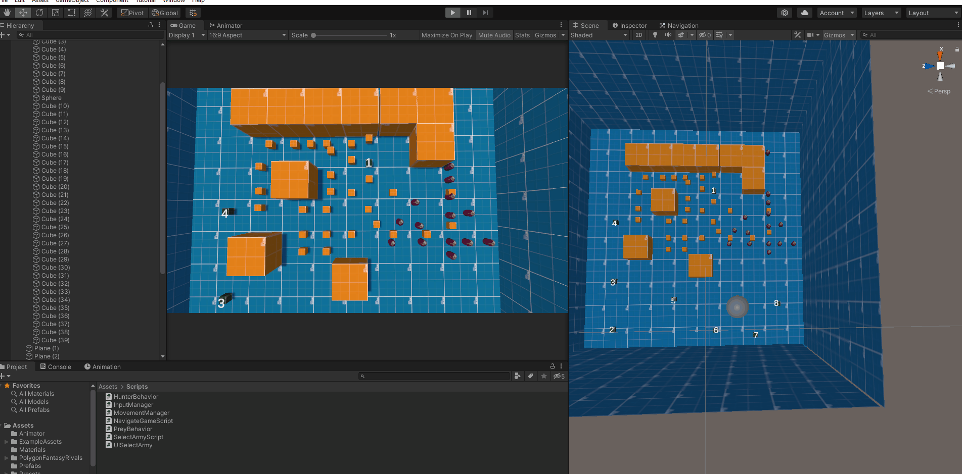 SteeringBehavior A prototype to implement steering behaviors The project implements several fundamental steering behaviors. Seek and Obstacle Avoidance Wandering Behavior and Obstacle Avoidance Wander Predator and Prey (Seek and Evade) Wandering army following a leader and Obstacle Avoidance Army following waypoints from 1-7