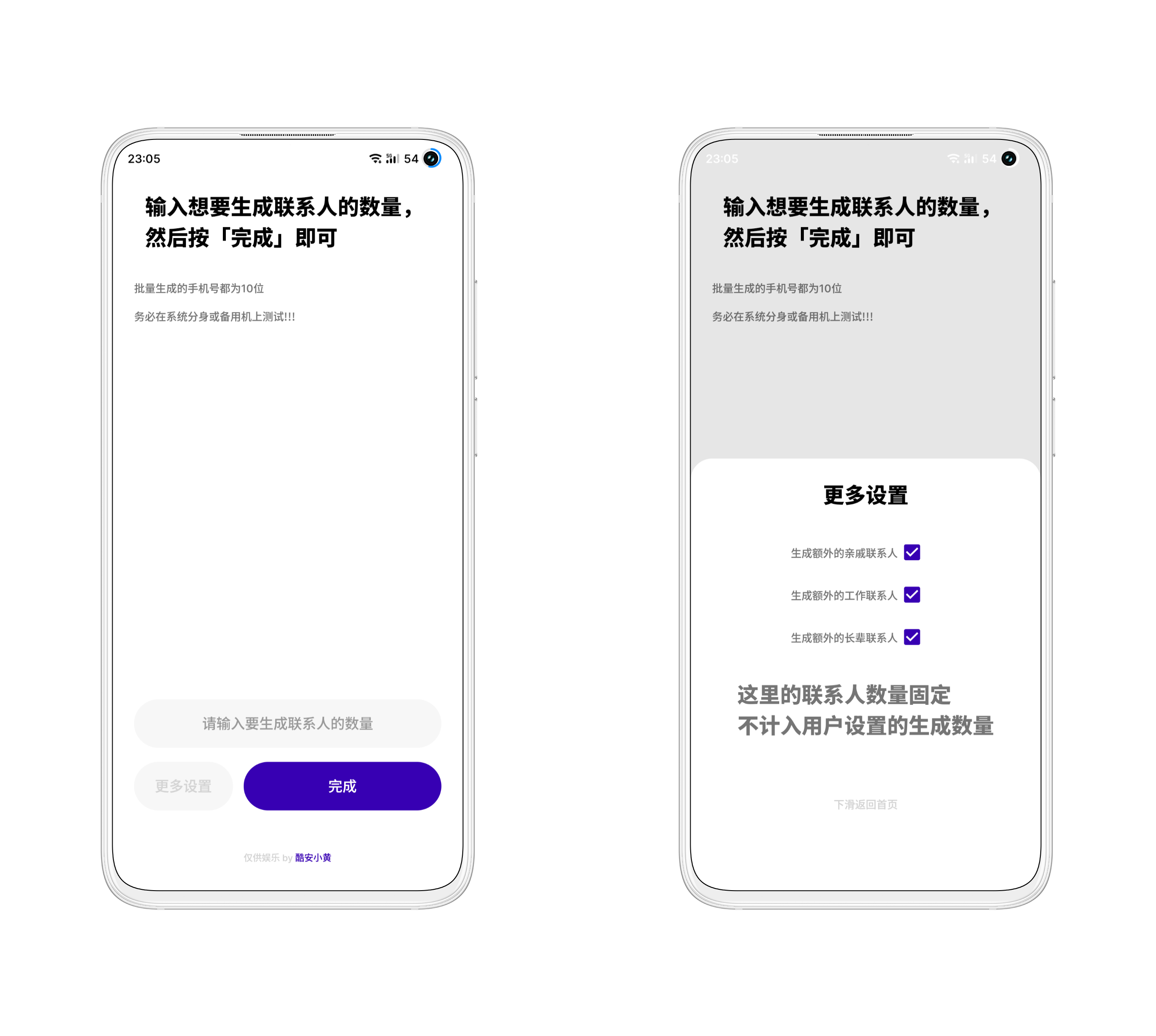 ContactBuilder 一个生成随机联系人的Android小程序 务必在分身访客系统或者备用机上测试 apk安装包:点此下载 1.0.1升级1.0.2请先卸载,因为上个版本的签名文件被我弄丢了。 支持生成中文姓名联系人 生成的联系人手机号均为10位国内无意义号码(考虑到隐私风险) v1.0.2新增生成亲戚联系人、工作联系人 v1.0.3修复额外设置不生效的问题