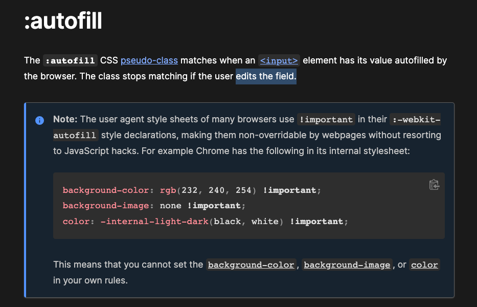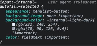 使用autocomplete屬性時,事實上可透過css pseudo class :autofill設定背景色。然而觀察實際上瀏覽器提供的預設樣式(這裡以chrome舉例),發現皆被設定為!important最高層級,無法輕易override background-color修改背景色