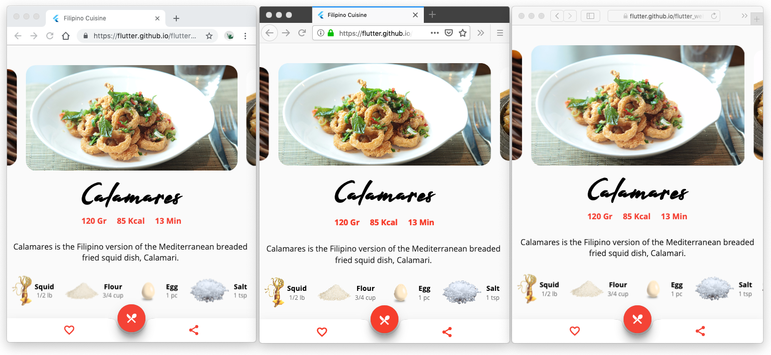 神奇之处就是将这些概念(客户端层面的)编译到浏览器中。我们重新实现了 dart ui 库,原本是基于 Skia 引擎被用在客户端上,现在是基于 DOM 和 Canvas API。当你编译 Flutter 代码到 Web 端,你的应用包括 Flutter 核心库,Web 端的 dart ui 库,所有的用 Dart 语言写的代码都会被编译成 JavaScript 代码,能够运行在所有的现代化浏览器中。