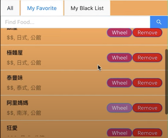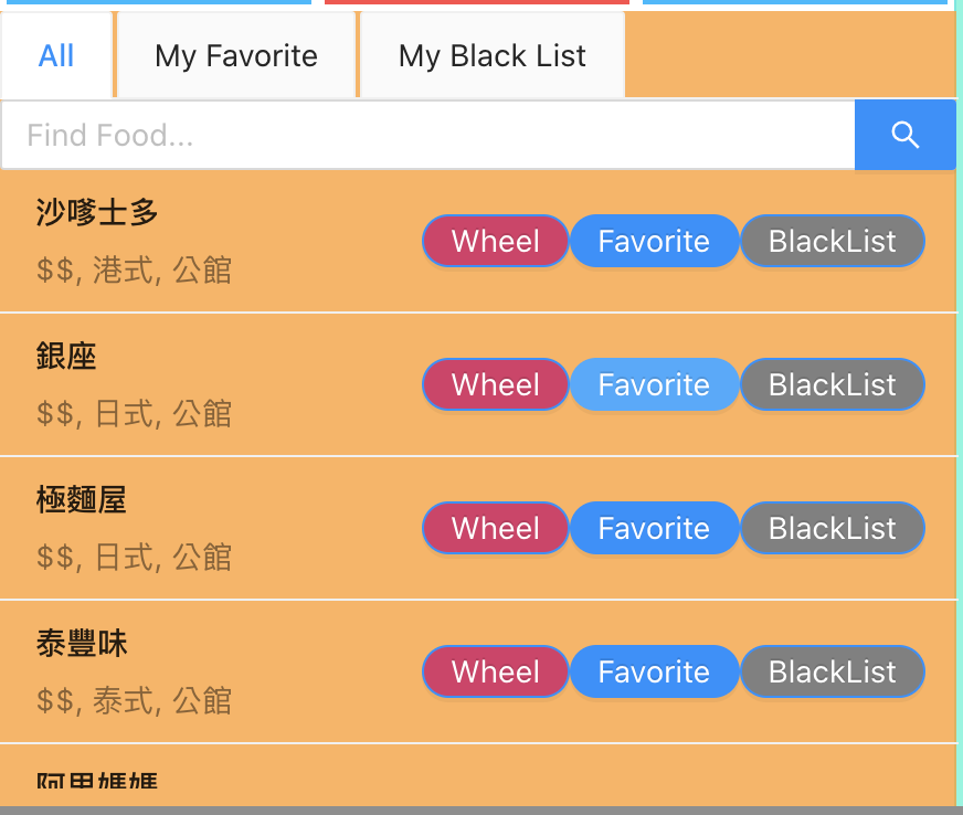 - 點擊按鈕可將餐廳新增至轉盤/最愛清單/黑名單,也可從清單中移除餐廳