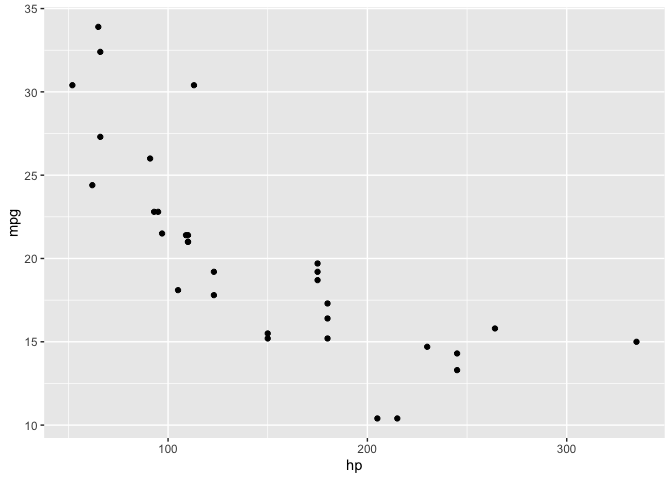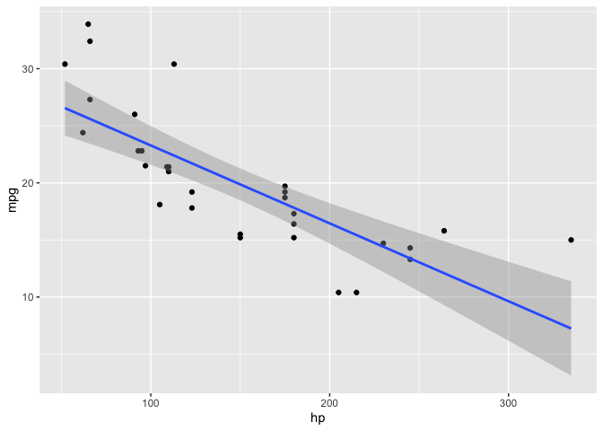 #> `geom_smooth()` using formula = 'y ~ x'ggplot(aes(x = hp, y = mpg), data = mtcars) +