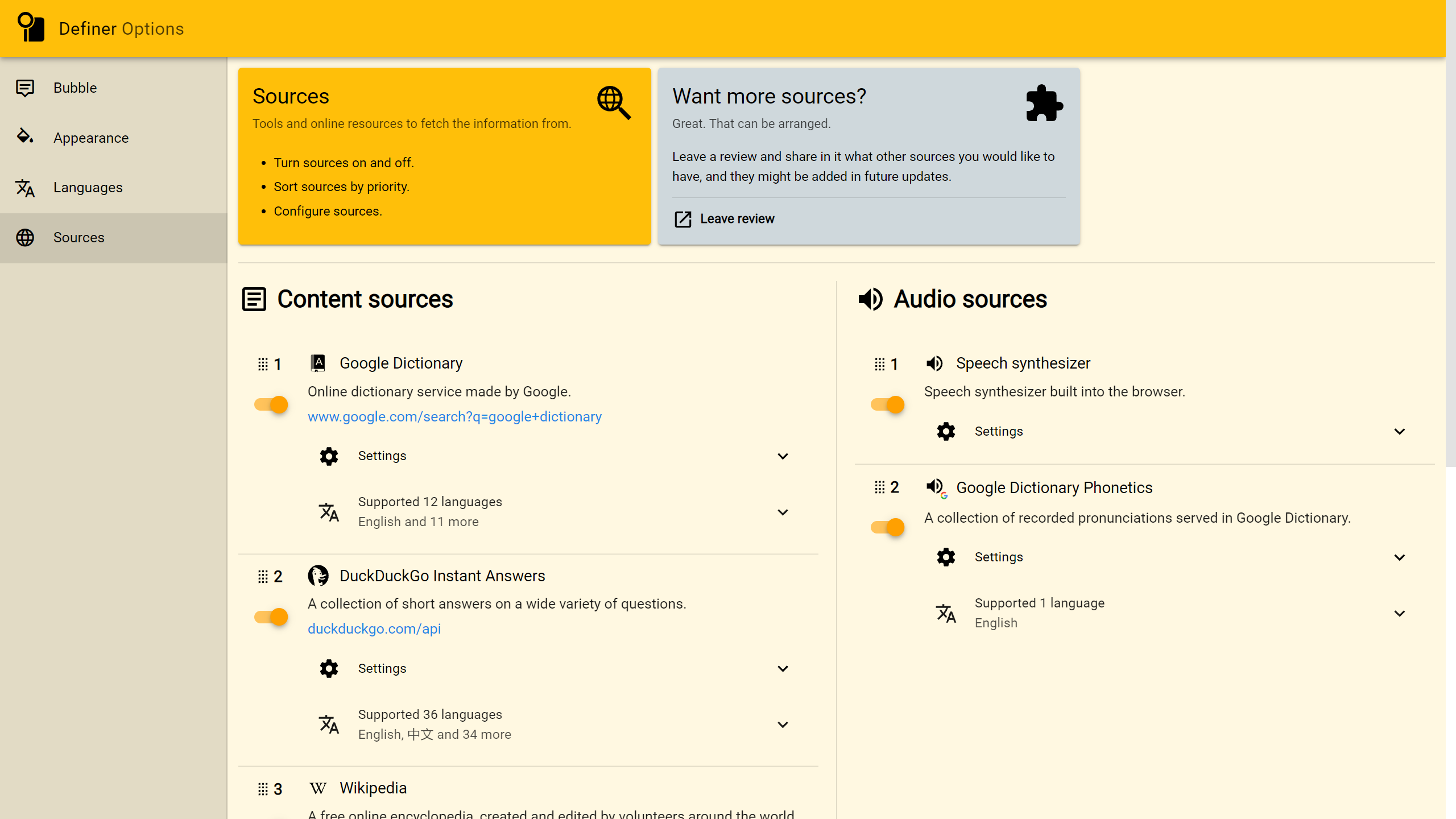 There are several built-in data sources available, and you can also add your own sources using the "Custom Source" feature. To do this, simply enter a website URL in the settings to include it as a source. You can also apply CSS (styling language) if you want to customize how it appears in the pop-up bubble.