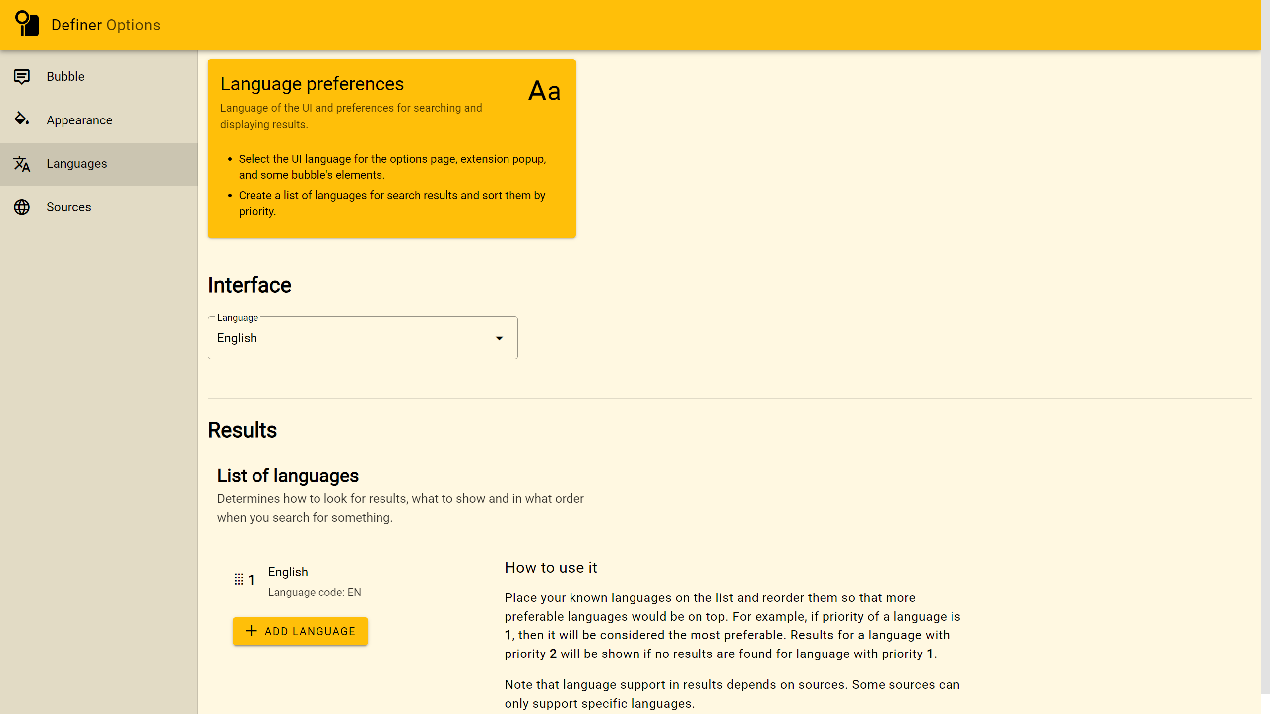 You can set your preferred languages in the settings and rank them by priority. If there's no information in your top-choice language, results in the next preferred language will be shown automatically. You can also manually switch between results in different languages directly from the pop-up bubble.