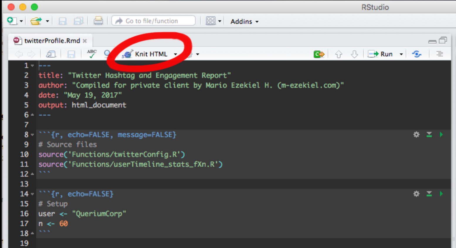 access_secret)Now that everything is installed, open the file R Markdown file twitterReport.Rmd. Enter the name of the account for which you wish to generate a report. You may also specify the number of tweets for the algorithm to retrieve and parse by changing the numerical value of "n".