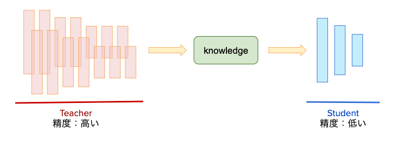 予測精度の良い深いモデルやアンサンブルさせたモデルを教師モデルとして準備しておき、その知識を軽量で再現できる生徒モデルの学習に利用する。