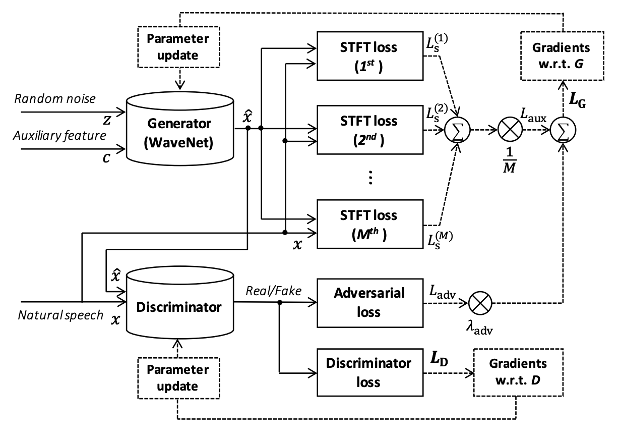 以下の図は多重解像度STFT損失と敵対的なトレーニング法を組み合わせたフレームワークのイメージ図。