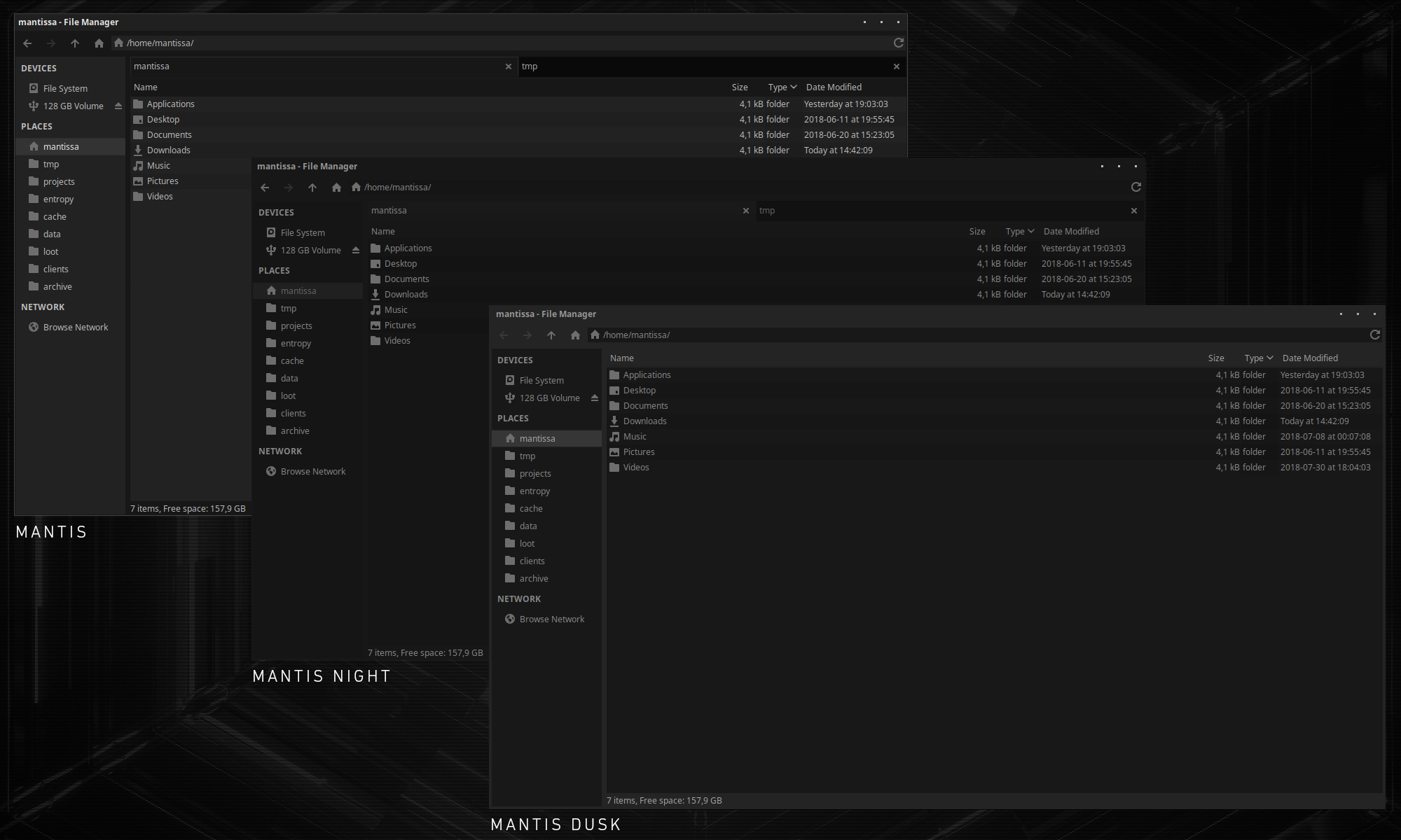 Mantis is the first iteration and has the highest contrast of the three. Mantis Dusk strikes a nice balance between ease-of-use and looks. Mantis Night is a very flat dark theme that doesn't work well in every setup, but I included it anyway.