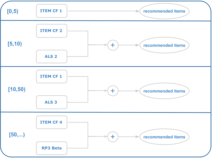 - [5, 10): number of interactions from 5 to 10, the model is an hybrid between an Item-Based CF and an ALS