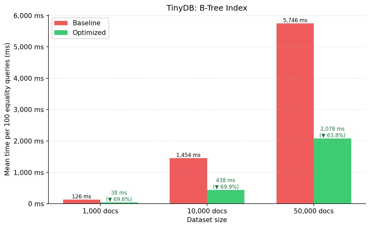 | 5 | TinyDB | B-Tree — 10k docs | 69,88% |