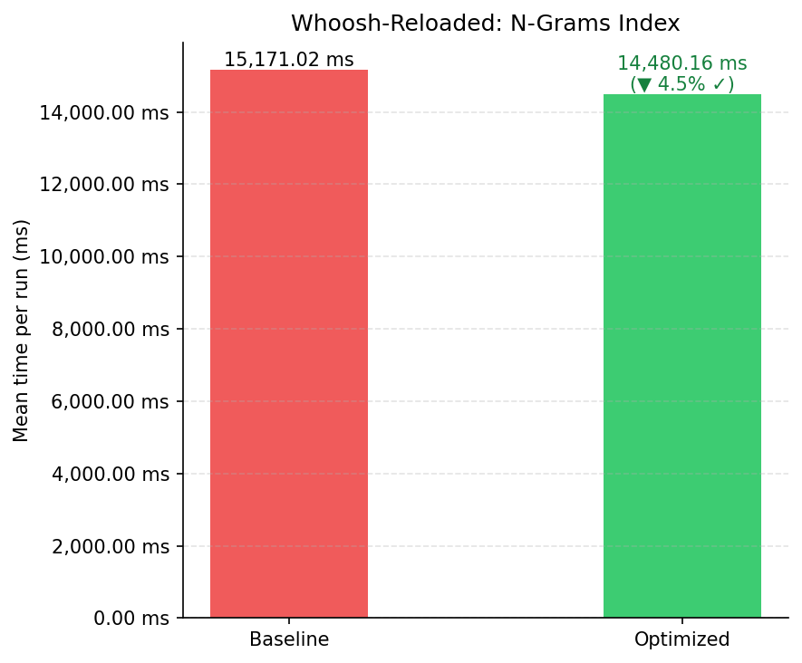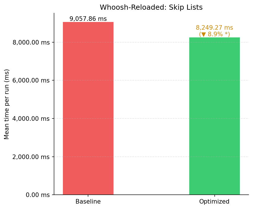 No whoosh-reloaded, os ganhos foram mais modestos,refletindo que o motor já possui otimizações internas, mas observáveis em todas as três frentes: Skip Lists reduziram a variância das consultas AND, o Filtro de Bloom antecipou lookups negativos antes do acesso a disco, e o índice de N-gramas eliminou a varredura linear do léxico em buscas wildcard sem prefixo.