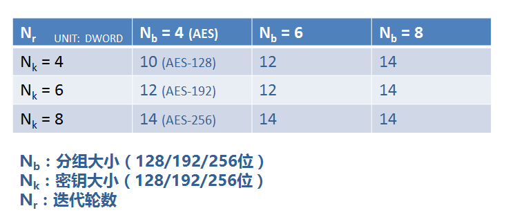 根据Rinjdael算法的定义,加密轮数会针对不同的分组及不同的密钥长度选择不同的数值: