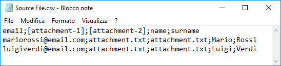 Attachments fields must contain the complete file path and the header must be "[attachment-N]" where N stands for the number of attachment.