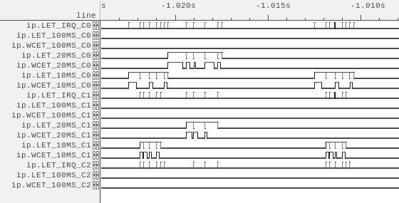 - Start LET task (y): Set to 1 if an LET task with period y (100/20/10) is activated. Set to 0 at the end of an LET task. As the LET tasks are sequenced back-to-back, only a small peak is visible between LET task with the same period y.